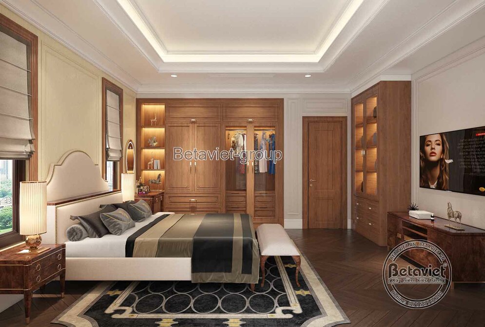 Đây là phong cách được đặt hàng nhiều nhất tại BETAVIET. Phòng ngủ tân cổ điển với tường sơn tím nhạt, phào chỉ trắng, đầu giường điêu khắc, đèn chùm pha lê tạo ra không gian vừa cổ điển vừa hiện đại, phù hợp với gu thẩm mỹ của gia đình Việt thành đạt.